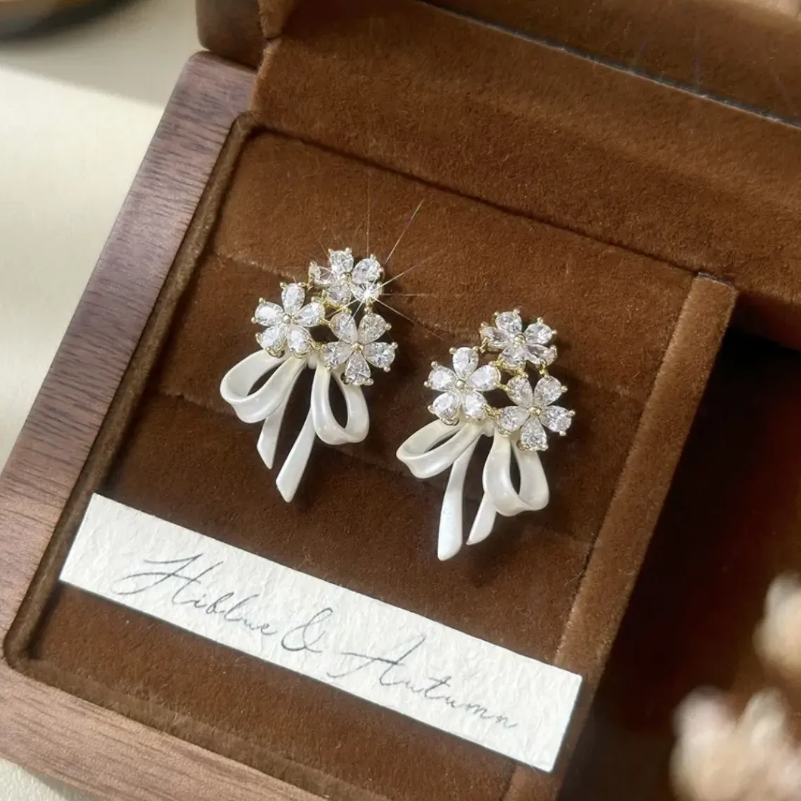 • Design: Floral studs with pearl-white ribbon bow