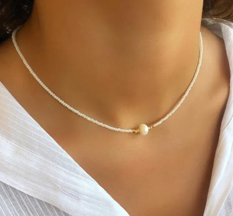This fresh water pearl necklace fits amazingly perfect and goes with anything. This minimal necklace fits the neck & looks amazing.