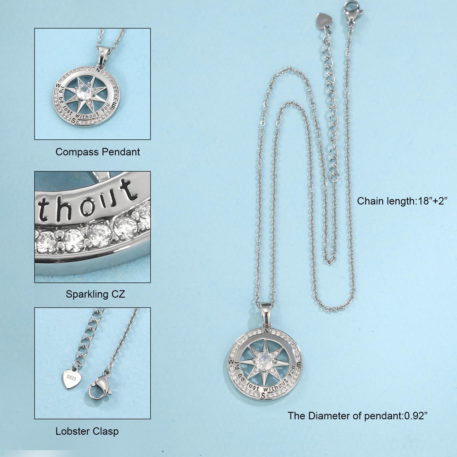 This compass necklace is made of hypoallergenic 925 sterling silver and Cubic Zirconia stones. The chain is a sterling silver chain, tarnish-resistant, nickel-free, lead-free, cadmium-free and does not contain any allergic elements. Suitable for long-term wear, especially for women with sensitive skin.